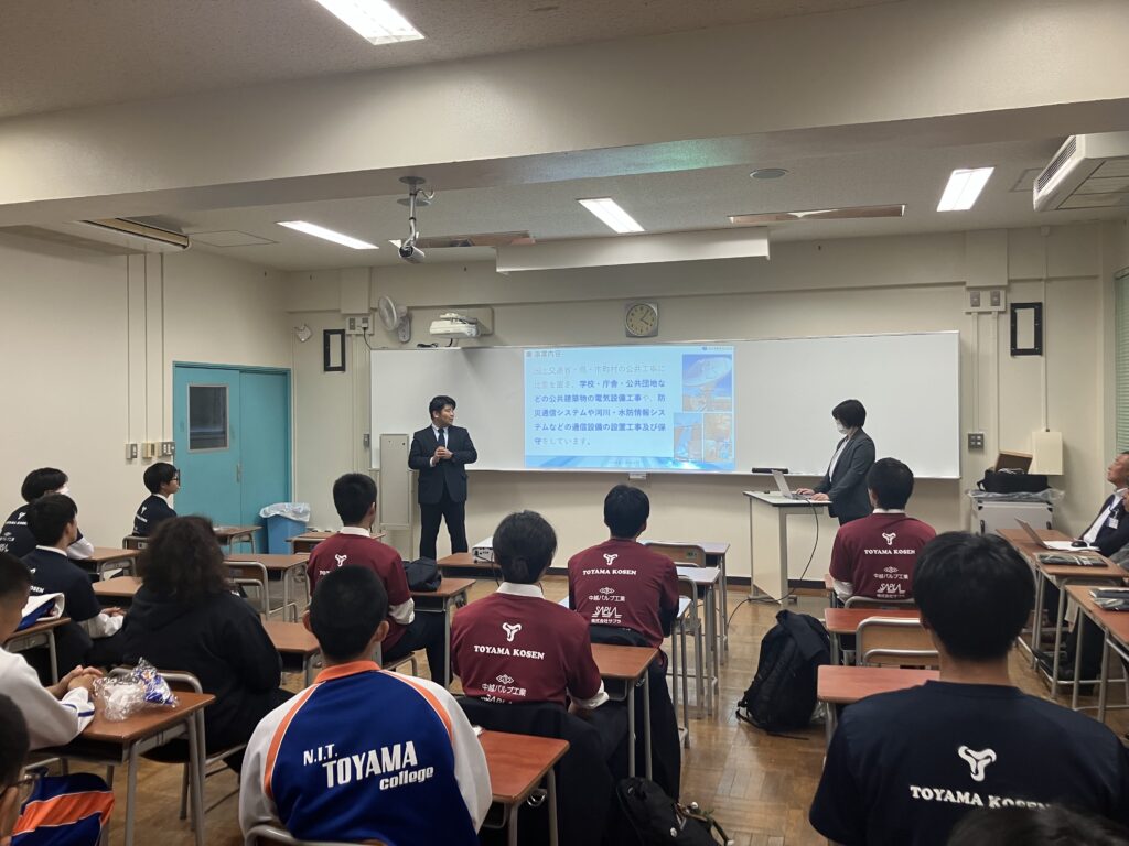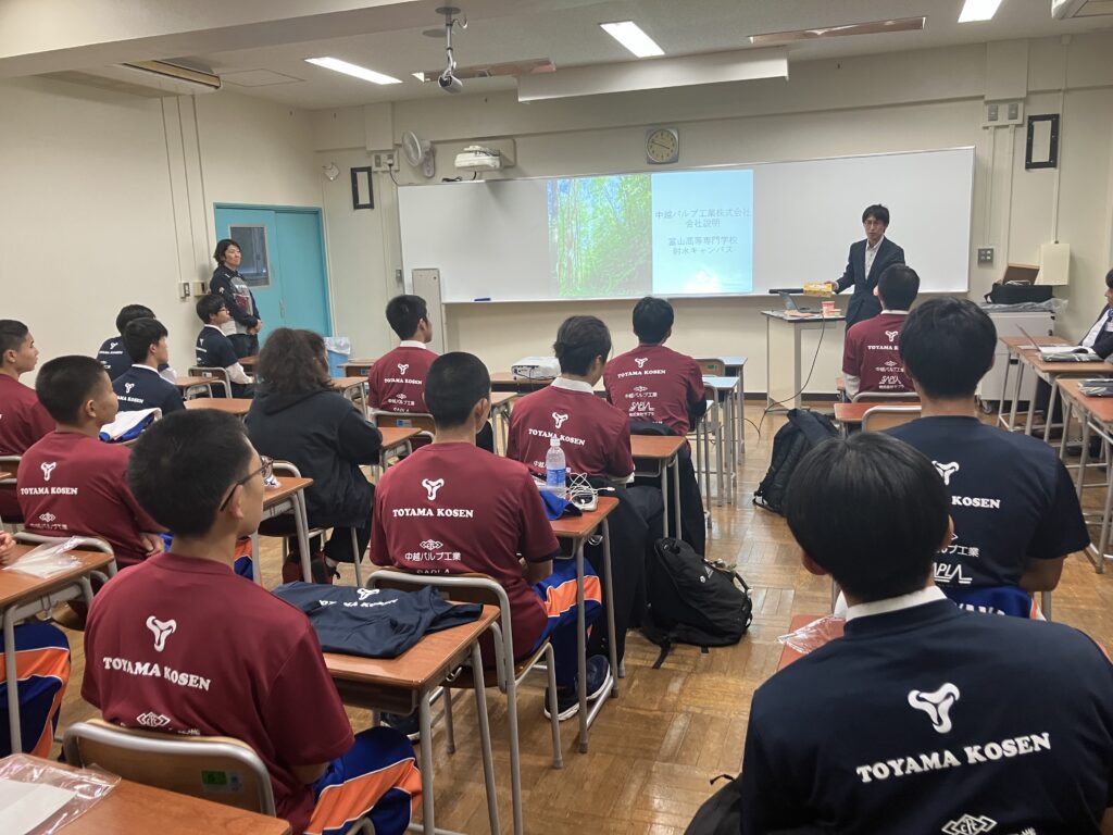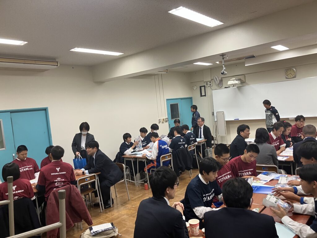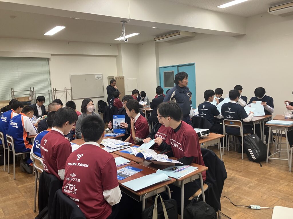 11月19日、富山高等専門学校射水キャンパスで、県内企業の魅力を知り、将来の職業選択にいかすことを目的とした出前講座が開かれました。講座には、学業とスポーツの両立を目指す野球部とラグビー部の部員25人が参加、中越パルプ工業、サプラ、キタノ製作、日本海電業の4社が仕事内容等について説明しました。グループに分かれての懇談の場では、笑いながら和やか雰囲気でコミュニケーションとる場面もあり、働くことへの理解を深めているようでした。部員には参加企業から揃いのTシャツが贈られました。